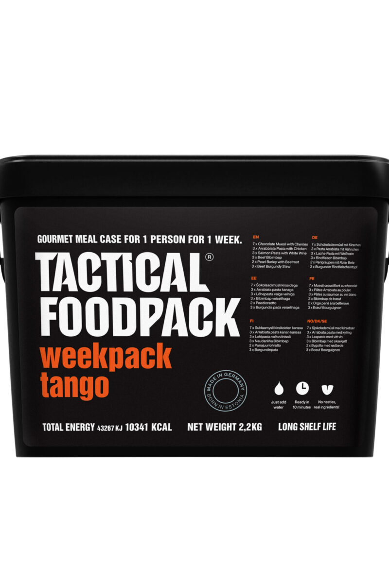 Weekpack Tango ist ein sorgfältig ausgewähltes 7-Tage-Mahlzeitenpaket, konzipiert für Abenteurer, Notfallvorsorge oder längere Outdoor-Aufenthalte. Es beinhaltet 21 Tactical Foodpack Mahlzeiten – 3 Mahlzeiten pro Tag – und gewährleistet somit die Energie, Nährstoffe und Vielfalt, die Sie benötigen, sei es in der Wildnis oder zur Vorbereitung auf unerwartete Situationen. Alle Mahlzeiten sind aus 100% natürlichen Zutaten hergestellt, unter Mitwirkung von Spezialeinheiten entwickelt und konzipiert, um auch unter extremen Bedingungen haltbar zu bleiben.